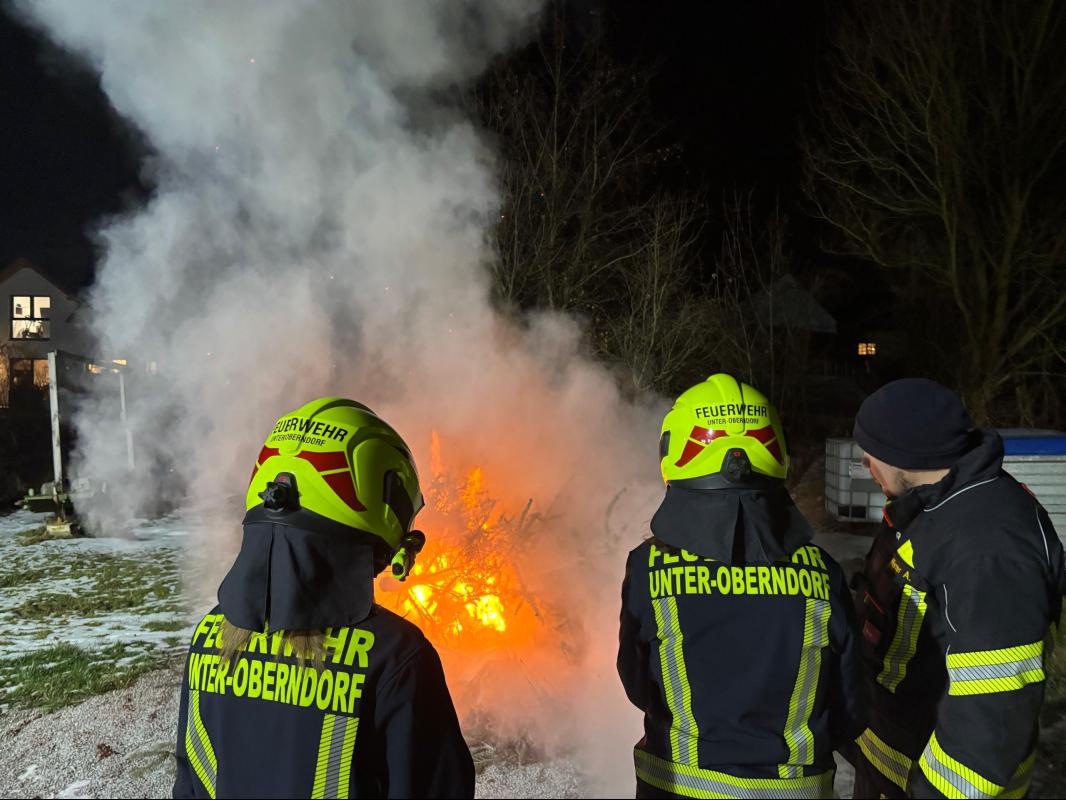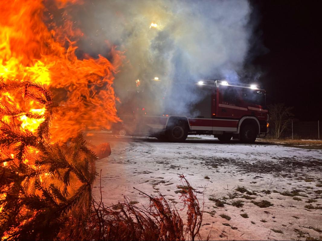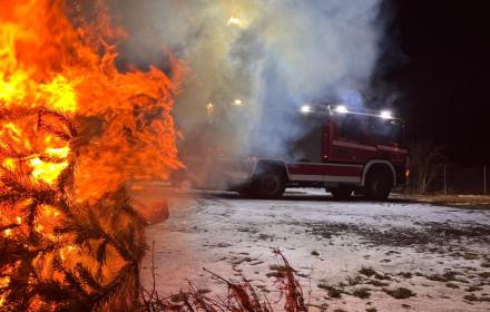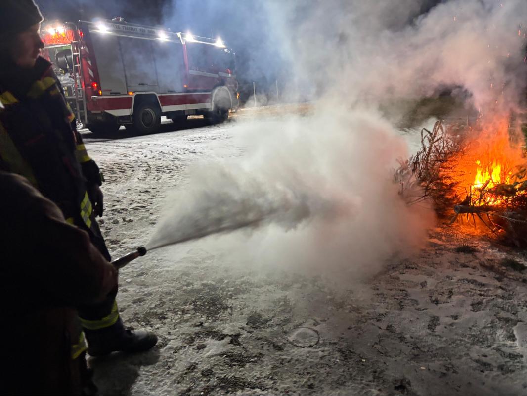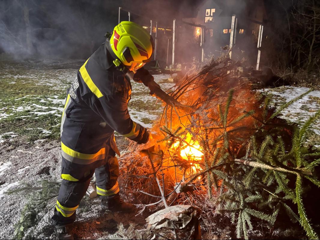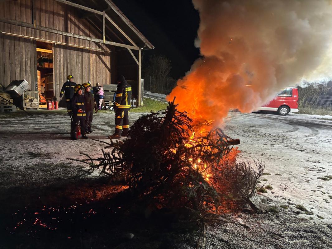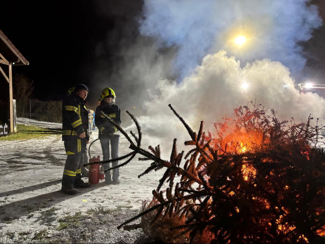 Beim praktischen Teil konnte in einrucksvoller Weise vorgeführt werden, wie schnell trockene Christbäume Feuer fangen. Anschließend wurde das Löschen des Brandes geübt.