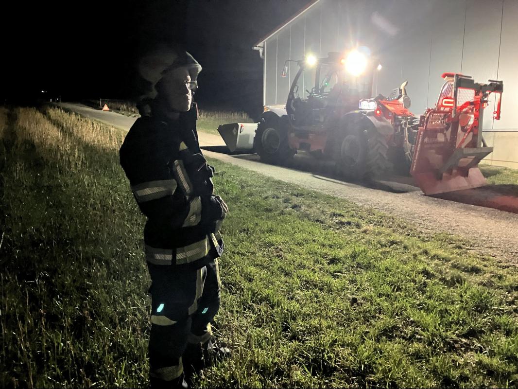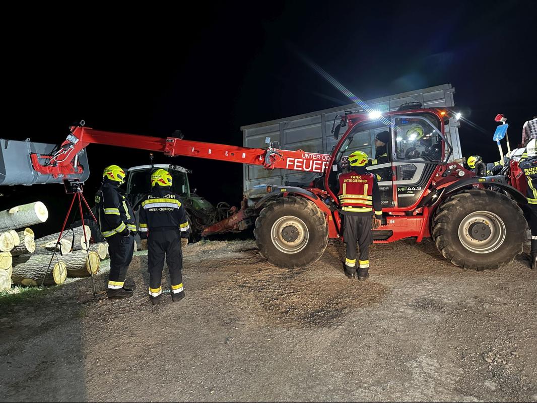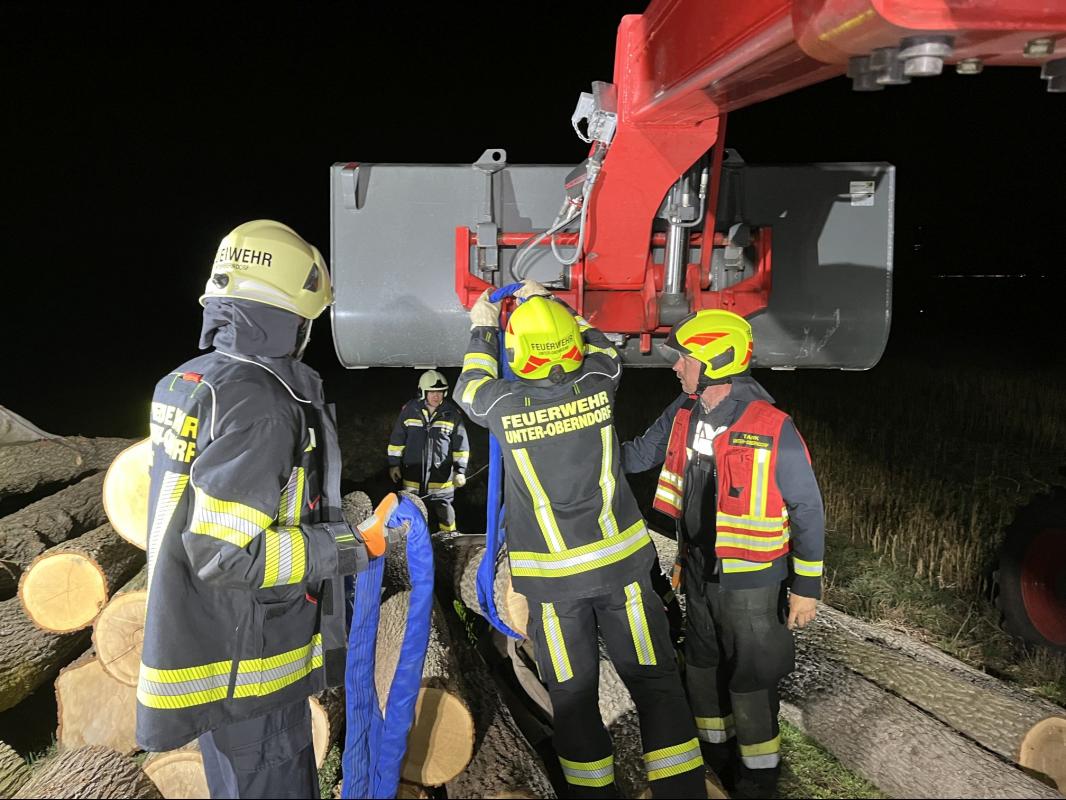 Nach dem Eintreffen am Übungsort galt der Vorrang der Menschenrettung. Mit dem Teleskoplader konnte der Baumstamm angehoben und die Person befreit werden. Nebenbei waren die Kameraden mit der Sicherung des verunfallten Fahrzeuges durch die Seilwinde des Tanklöschfahrzeuges beschäftigt.