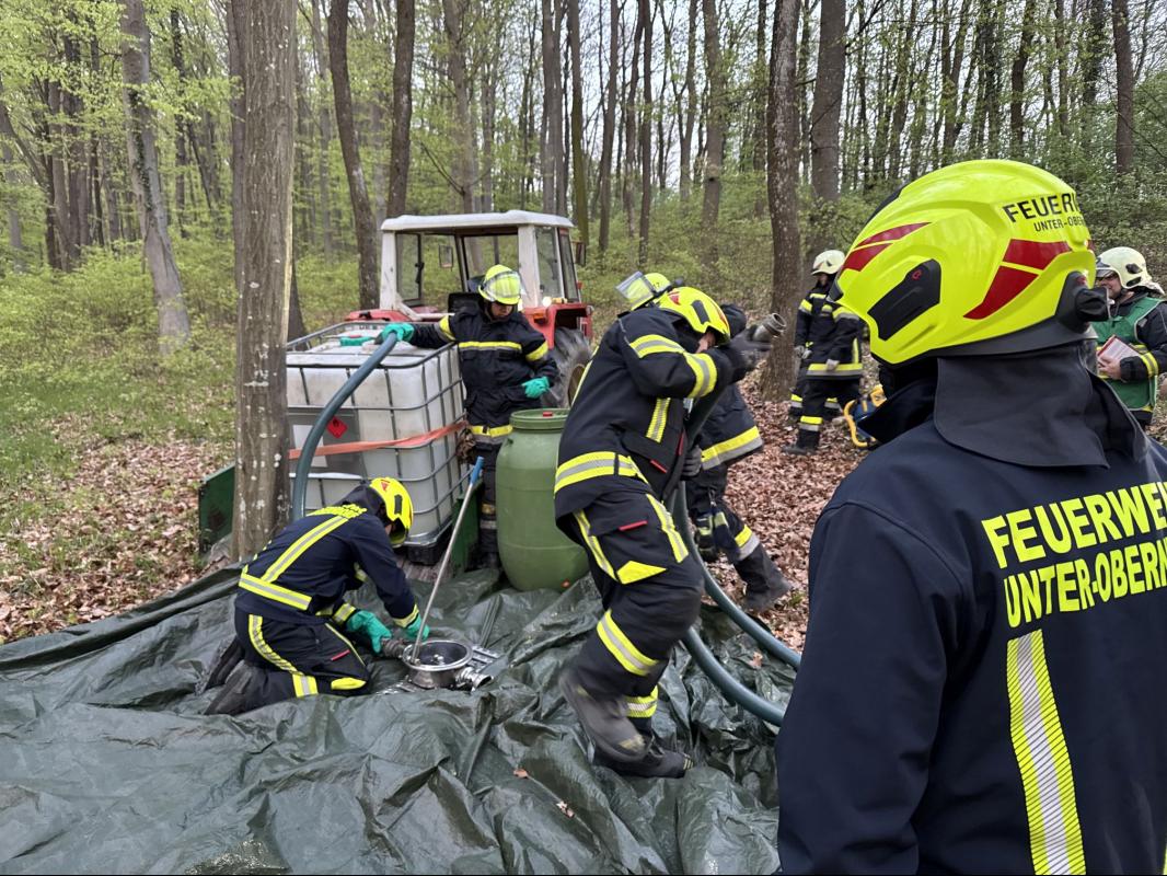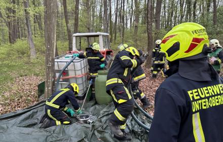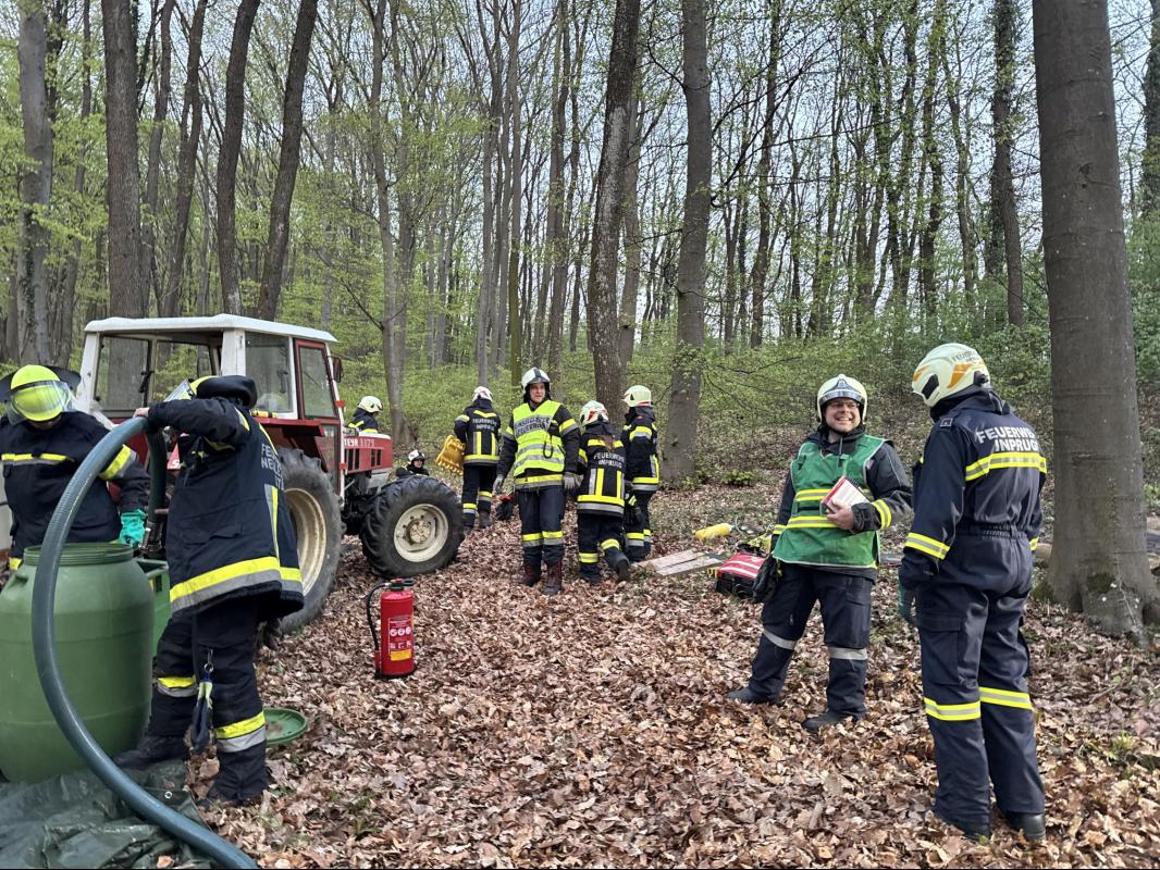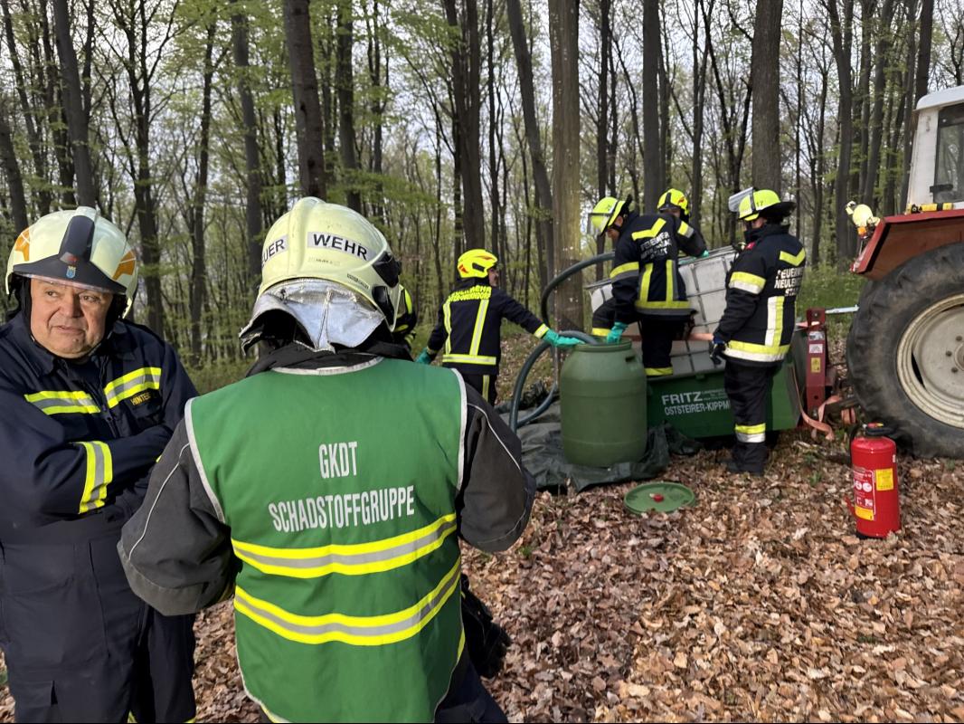 Bei der Monatsübung in Inprugg war folgender Sachverhalt aufgebaut worden: Eine Person wurde zwischen einem mit 1000l Dieselkraftstoff befüllten Tank und einem Baum eingeklemmt. Die Schadstoffgruppe hatte die Aufgabe den Kraftstoff umzupumpen, um die Menschenrettung zu erleichtern.