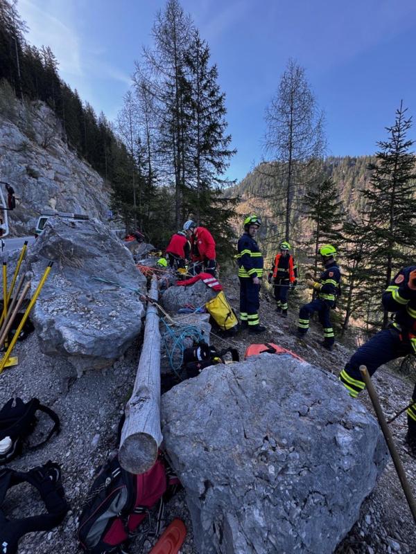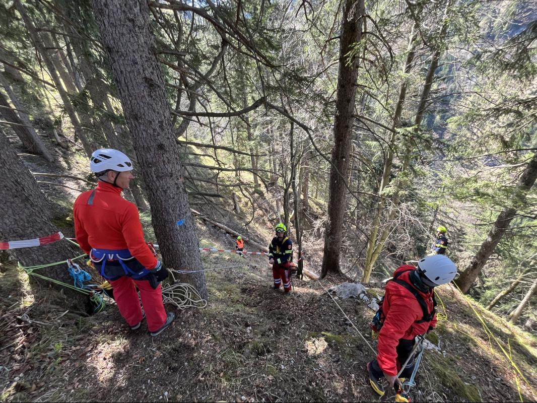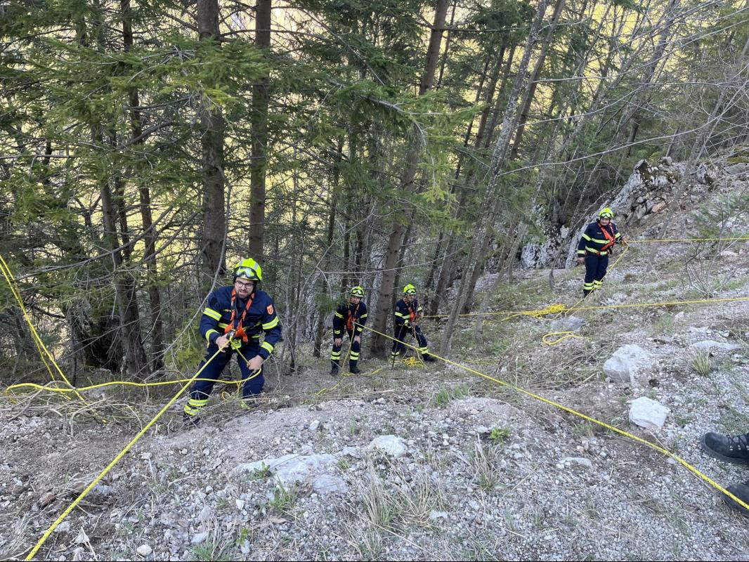 3. Arbeiten im Gelände mit der Bergrettung: Zusammenarbeit, Seiltechnik im Steilgelände mit besonderem Augenmerk auf die Waldbrandbekämpfung (Schutz vor abrollenden Steinen, Bäumen,...), Arbeiten mit der Motorsäge im angeseilten Zustand