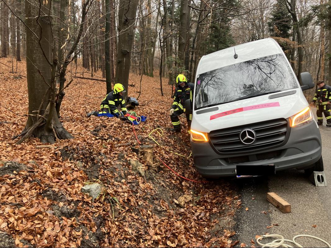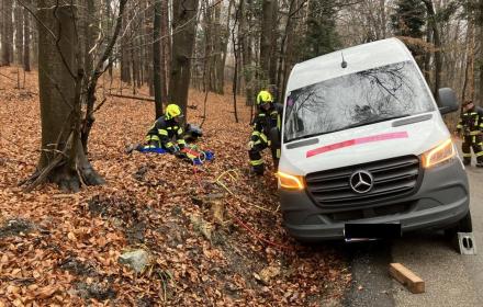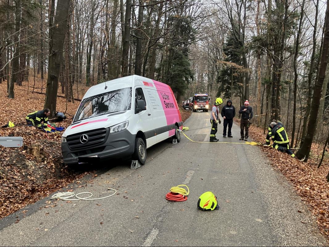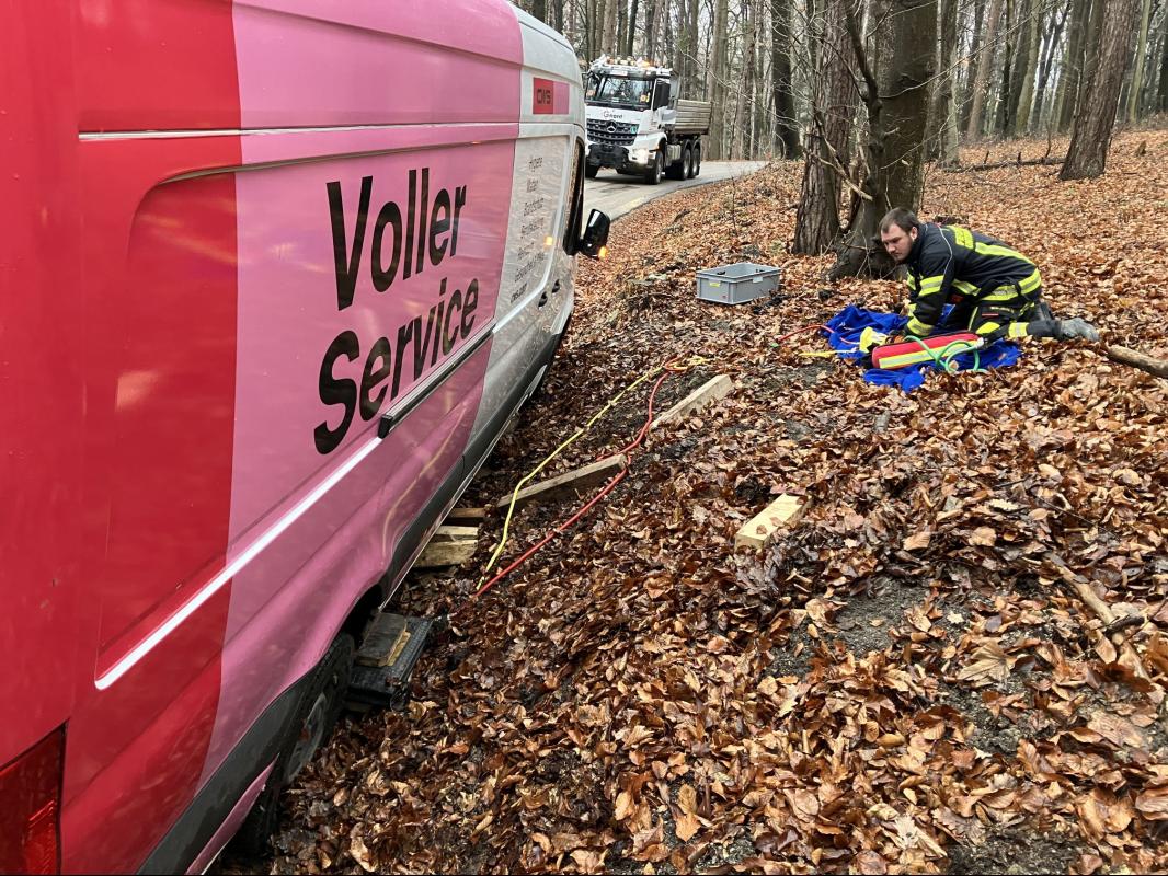 Dort war ein Mercedes Sprinter bei einem Ausweichmanöver in den stellenweise sehr tiefen Straßengraben gerutscht und saß am Fahrzeugboden auf.